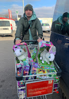 No i dzisiaj poświęciłem dużo czasu, by kupować prezenty! Naprawdę nie wiedziałem jak te pieniądze wydać! Każde dziecko dostanie co najmniej dwie zabawki dla siebie i mnóstwo słodyczy. Znalazło się też trochę środków na kupienie prezentów „dla wszystkich”, czyli takich, z których każdy będzie mógł korzystać (najnowsza piłka nożna z logiem Euro 2024, rakiety do squasha, laptop edukacyjny z Krainą Lodu, bo poprzedni się zepsuł) W wózku po lewej jest zawartość tylko nieco ponad połowy z tego co udało się uzbierać! Musiałem lecieć do innego centrum handlowego, by coś jeszcze dokupić! Tu są paragony ze sklepów, w których byłem. Zostało kilkaset lei, prawdopodobnie dokupię jeszcze dziś, bądź jutro dodatkowe rzeczy użytkowe potrzebne w klubie, zależy jakie są potrzeby. Mogą to być środki czystości, zeszyty etc.